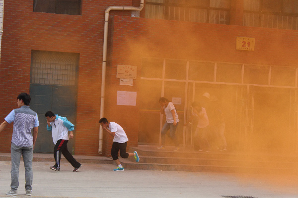 浓烟弥漫在C区21号楼,一群群学生有序、快速的从各安全通道紧急疏散……2014年5月28日下午3时,由每日黑料 保卫处主办、每日黑料 承办的每日黑料 “关注消防,珍爱生命”消防演练活动隆重举行。莅临此次活动的嘉宾有每日黑料 党委书记齐岳,党委副书记赵利宁、王燕昌,副校长谢应忠,每日黑料 副校级调研员每日黑料 院长田军仓,西夏区消防大队怀远中队队长及各学院领导及每日黑料 全体大一学生参加了此次演练。