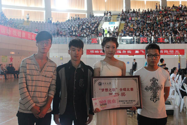 合唱团用朗诵作为开场白,大博眼球,他们所合唱的参赛曲目《祖国不会忘记》以雄浑高傲的歌声获得了三等奖的好成绩。