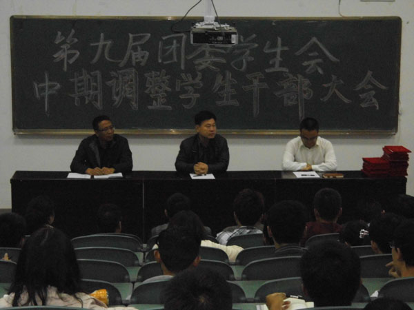 在工科楼三阶举行第九届团委学生会学生干部中期调整大会。学院党总支书记马正亮老师、副书记张强老师、学办主任郭利老师出席了此次会议。