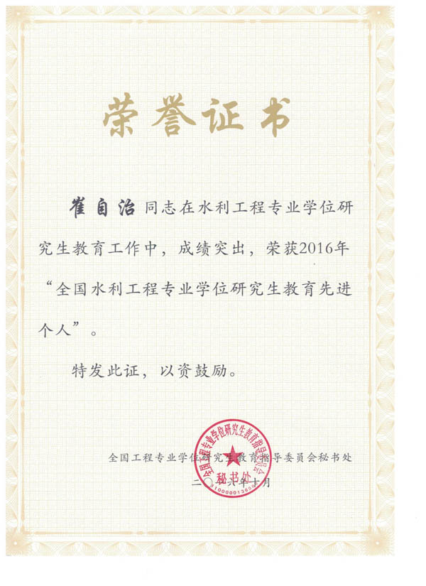 崔自治教授获得“全国水利工程专业学位研究生教育先进个人”,硕士研究生寇小娜获得“全国水利工程专业学位研究生实践优秀成果奖”。