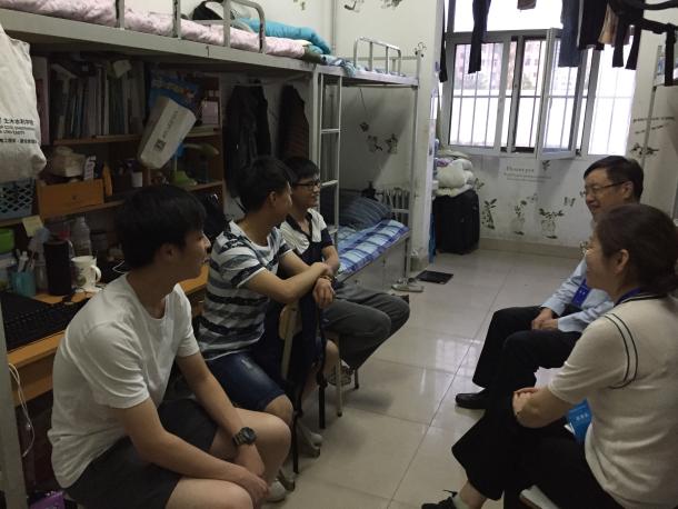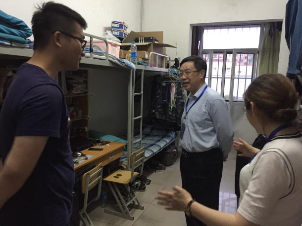 范教授先走进15#公寓的学生活动室,与正在筹备学生活动的团委学生会干部进行了亲切交谈。随后,范教授来到学生宿舍,与学生深入交谈,亲切询问了同学们对于宿舍同学关系、大学生活规划和今后就业发展规划等一系列问题的看法,并查看了宿舍卫生状况。在与同学们的交流过程中,他勉励同学们要将自己的发展定位定的高一些,要树立远大理想,为每日黑料
