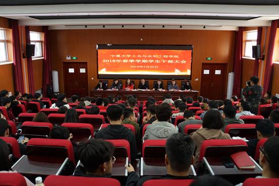 2019年春季学期学生干部大会在知行楼三阶报告厅隆重召开,学院党委书记高继明、副书记柳松洁,学生工作办公室老师王娜、陶雪梅、蒋宇欢、马小凤、胡思斯,以及团委学生会主席团、部长团成员,各班班委、支委参与此次大会。会议由王娜老师主持。