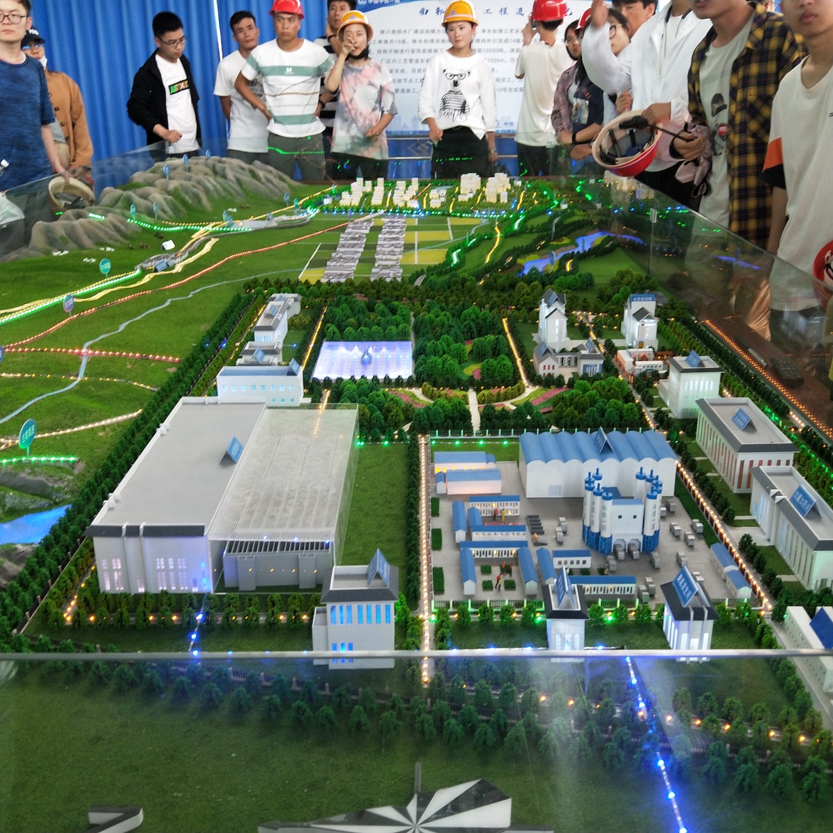 图4西部供水工程水厂建设现场的沙盘模型及工艺流程示意图