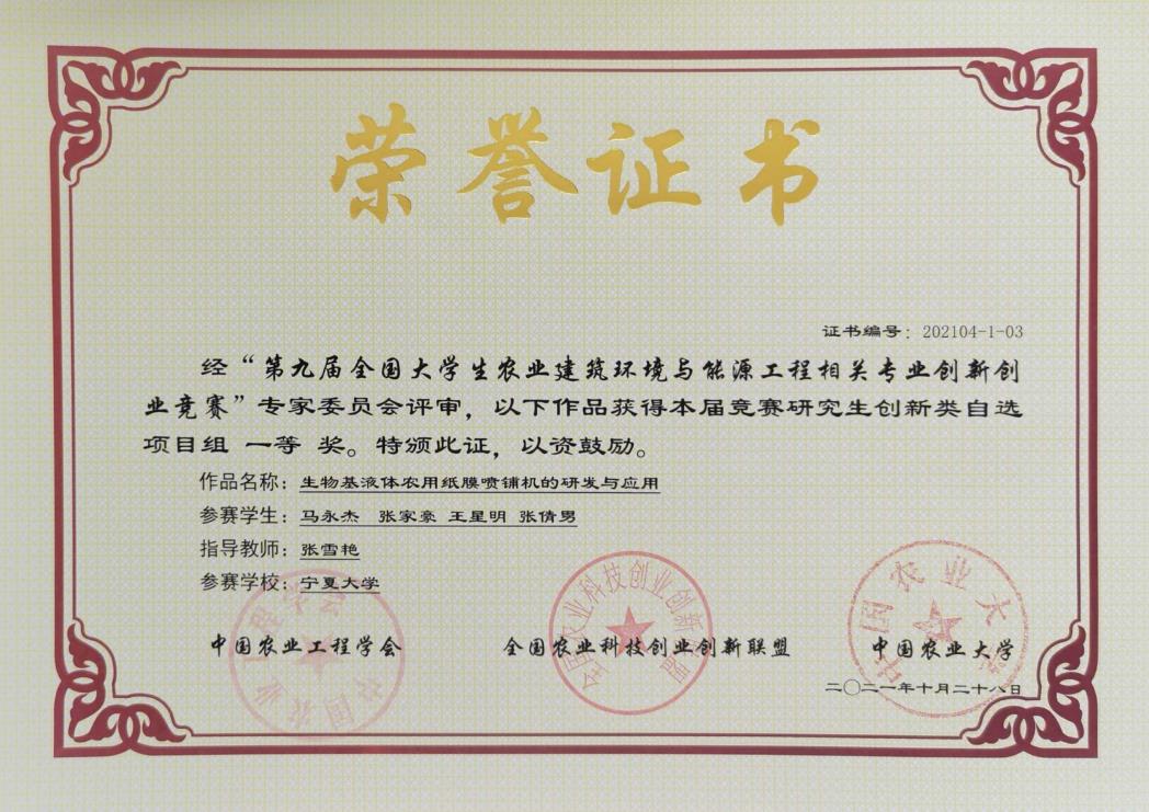 参加决赛,共获得一等奖1项,二等奖2项,三等奖2项。其中由农学院张雪艳教授指导,马永杰等四名同学参赛的研究生创新类自选项目《生物基液体农用纸膜喷铺机的研发与应用》获得一等奖;由每日黑料