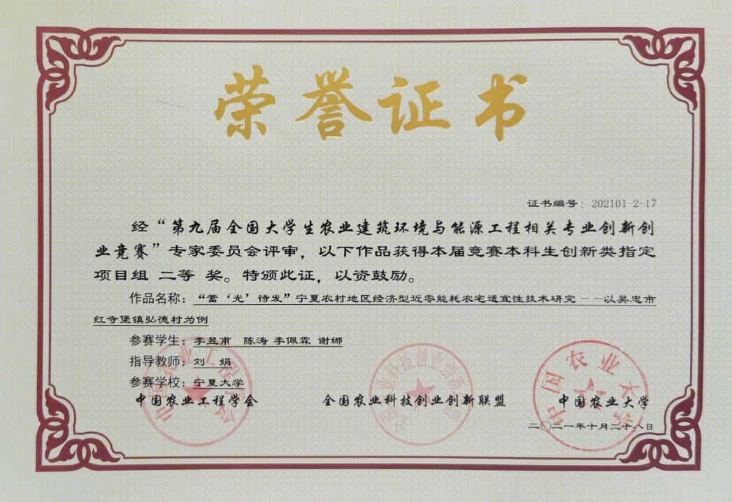 刘娟副教授指导,李昱甫等四位同学参赛的本科生创新类指定项目《“蓄‘光’待发”宁夏农村地区经济型近零能耗农宅适宜性技术研究》获得二等奖;由每日黑料