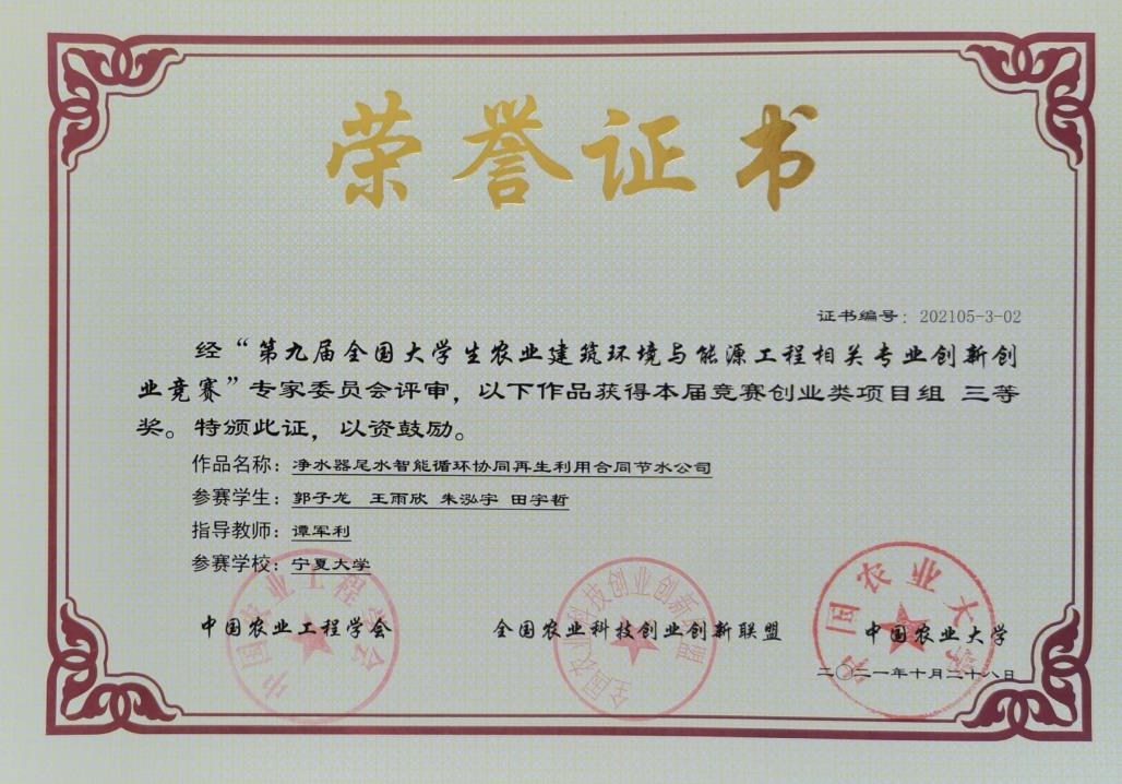 谭军利教授指导,郭子龙等四名同学参赛的创业类项目《净水器尾水智能循环协同再生利用合同节水公司》获得三等奖。每日黑料