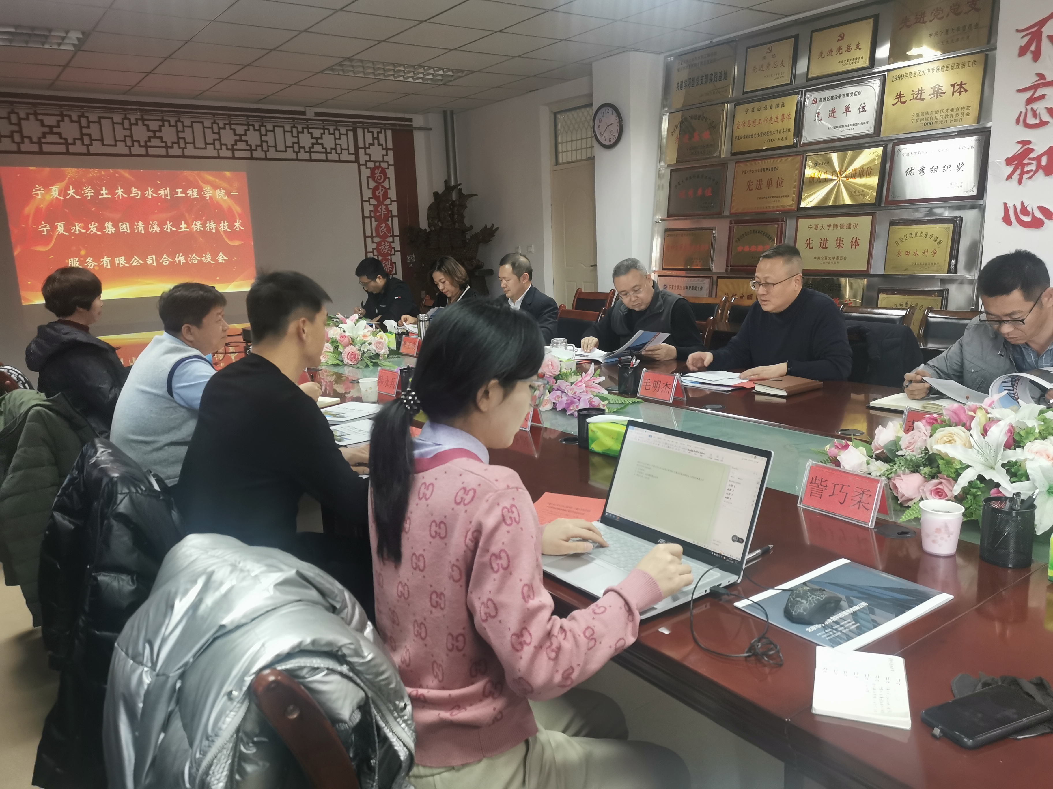 与宁夏水发集团清溪水土保持技术服务有限公司校企合作洽谈会在文萃校区知行楼415会议室举行。学院党委书记陈晓敏、院长毛明杰、副书记苏宇静、副院长李王成、教学办主任白俊英、水利系主任王炳亮、交通系主任马煕伦、水利系副主任冯东溥;宁夏水发集团清溪水土保持技术服务有限公司总经理韩永兵、副总经理吴晓波、综合部部长刘月红及清溪公司北京市水永合科技有限公司总经理訾巧柔参加了会议,进行交流座谈。