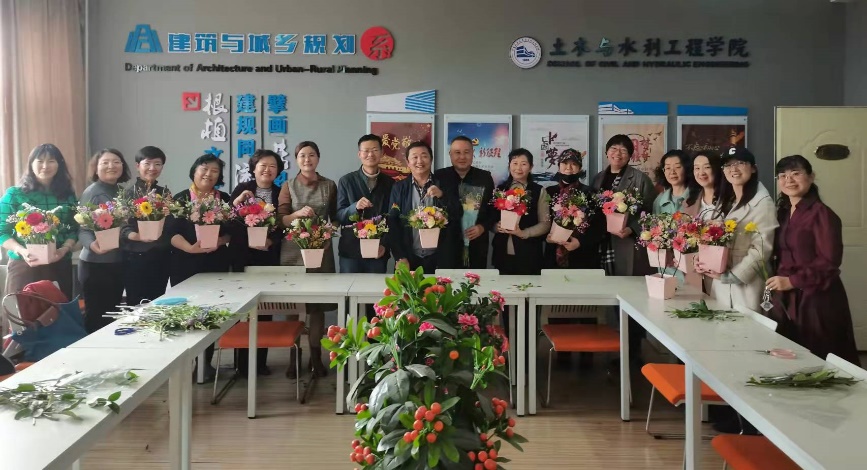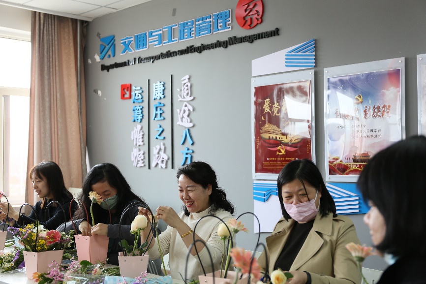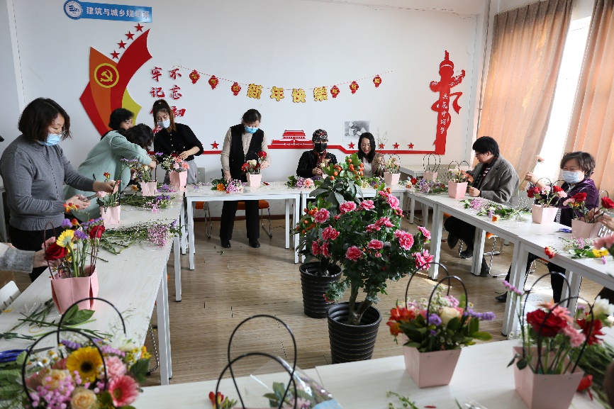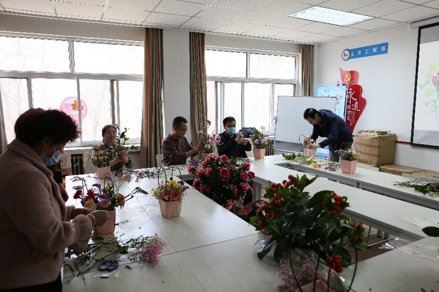 于3月9日下午开展了“凝心惠宜、共筑幸福”插花活动,此次活动由副院长朱磊主持,全院教职员工参加了此次活动。主题活动开始,学院邀请专业花艺师团队为大家开展花艺培训,插花活动在各系活动室进行。学院为教职员工们准备了丰富的花材,生机勃勃的向日葵、热情奔放的大丽菊、沁人心脾的玫瑰、含苞待放的月季、清新淡雅的小雏菊、星星点点的满天星在老师们的巧手下变得格调高雅、清新怡人。通过活动,学院领导全程与教职员工一起插花,达到了增进交流、丰富生活、陶冶情操、凝心聚力、团结奋进的目的,也为学院推进“十四五”规划、实现高质量发展统一了思想,凝聚人心。