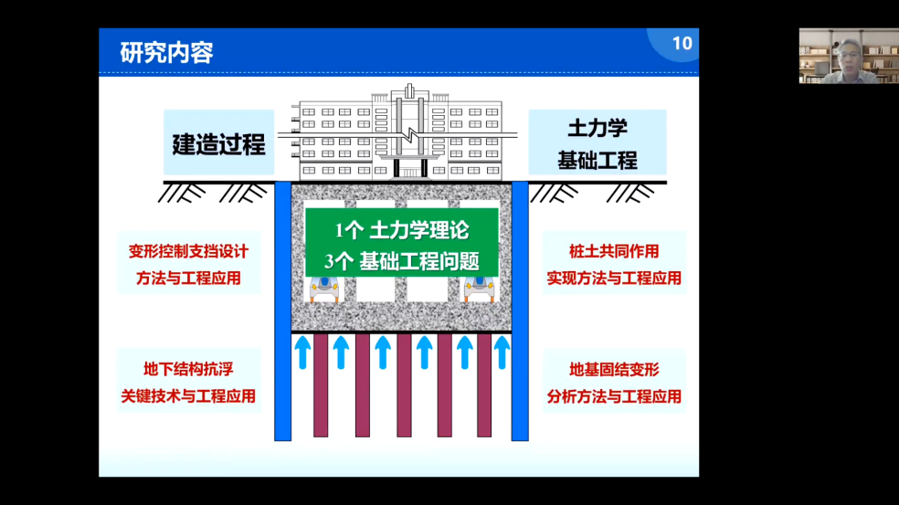 梅国雄教授从自己的科研经历出发,基于罗素、哥德巴赫等名人故事,指出:“要敢于质疑,有质疑才会有创新”。介绍了主动式反渗透防腐技术、新型柔性水下储油装置、传统固结理论存在的边界不协调、土压力与变形之间关系等问题,阐述了“童心”与“创新”之间的关系,还通过多个典型的工程案例分析如何从直觉观察演进出创新突破的实践过程,以此勉励研究生要善于发现问题,养成独立思考的习惯。