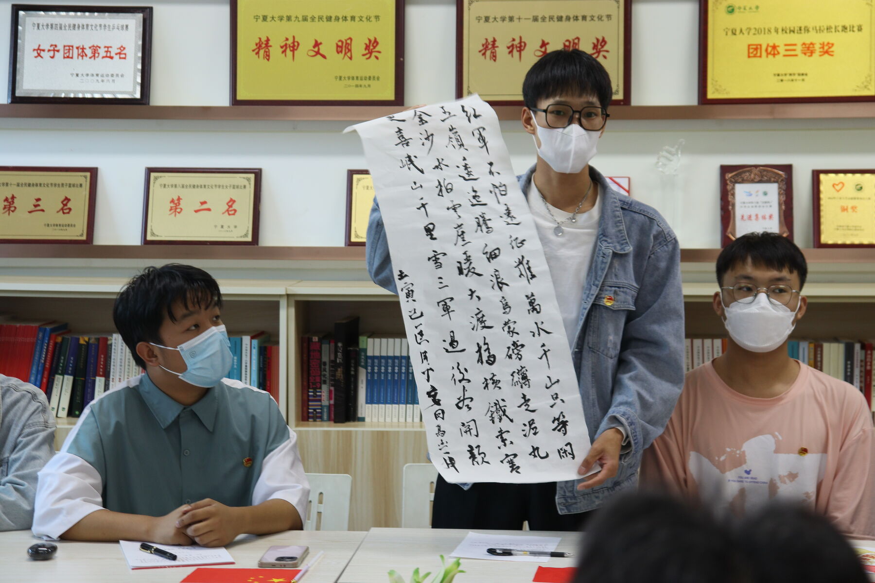 活动开始,全体起立观看了庆祝中华人民共和国成立七十三周年的升旗仪式,同学们庄严注视着大屏幕上国旗的缓缓升起,并唱响国歌。接着,王雪娜图文并茂向团支部成员分别讲解了国庆节的由来、发展及中国共产党第二十次全国代表大会的召开进程。通过知识竞答的方式向同学们梳理了几个关键知识点,现场氛围热烈浓厚、气氛活泼。在最后的交流分享环节,团支部成员积极踊跃,介绍了学院“二十四节气”特色团日活动的成果手绘画及自己为了庆祝国庆节所创作的书法以及绘画作品,同时,同学们也从校园防疫活动、三下乡社会实践经验、中国共产党百年奋斗重大成就等不同角度分享了自己体悟感受。