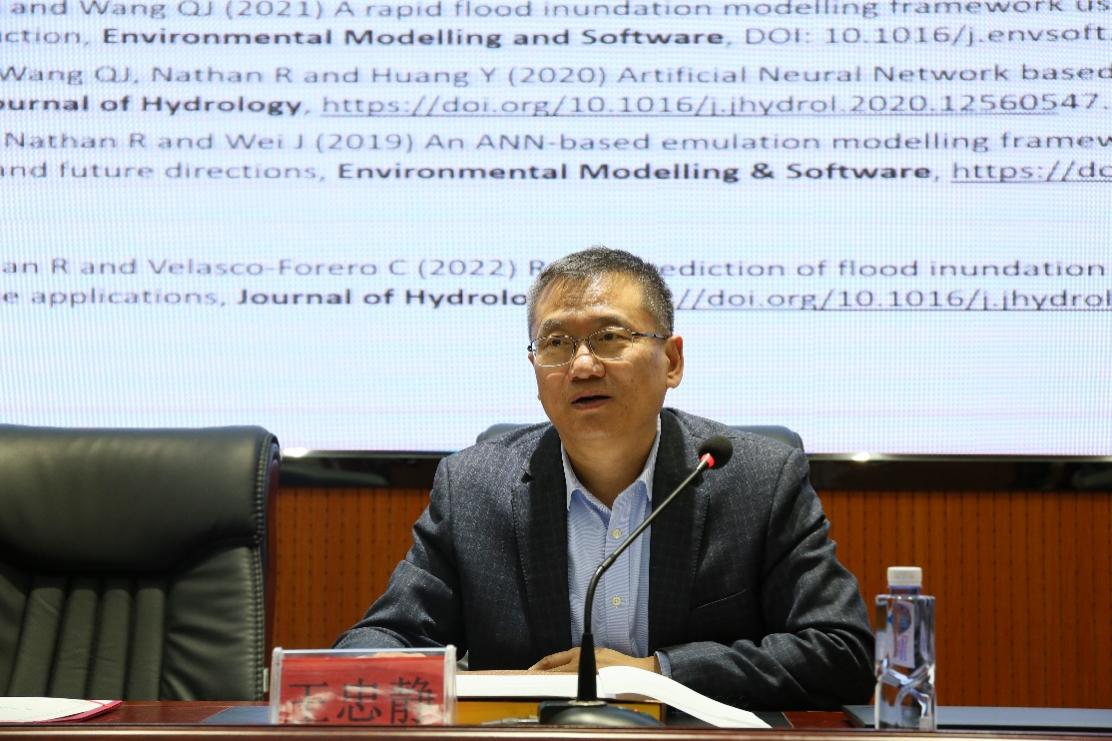 王全君教授主要从事水文预报研究,主持了多项科研项目,为澳大利亚国家水文预报成果的落地应用做出了重要贡献,也积极促进了中澳两国在水资源研究和教育方面的合作,先后发表150余篇学术论文。报告会上,王全君教授以“时空统计模型对物理过程水文预报能力提升研究”为题,系统介绍了其团队近些年来在基于统计时空模型提升物理过程模型的预测水平领域相关国际前沿研究成果。