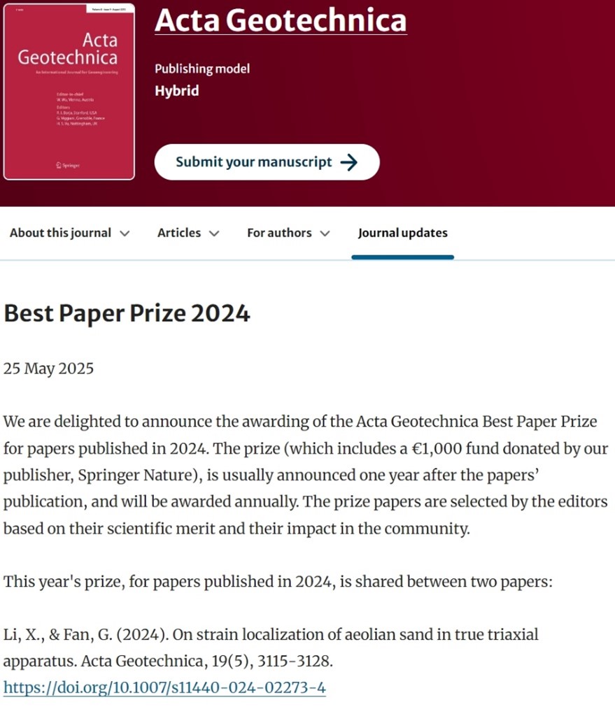 ��ѧ������Ŷӷ����ڹ������������콢�ڿ�Acta Geotechnica���о��ɹ���On strain localization of aeolian sand in true triaxial apparatus������ø��ڿ�2024���������Ľ���Best paper prize����������Springer˹���ָ�ٷ��ṩ��1000ŷԪ�ֽ�����Acta Geotechnica�����������������SCIԴ�ڿ�֮һ��Ϊ�й���ѧԺһ��Top�ڿ��������������Ľ���2012��������ÿ����ɱ�ί��ѡȡ1~2ƪ���Ļ�����١���ѧ�����Ϊ�����ĵ�ͨѶ���ߺ͵�һ���ߣ���ʿ������ΰΪ��ͬ��һ���ߣ��ù����õ��˹�����Ȼ��ѧ������Ŀ��No.12162028�������ĿƼ���������˲żƻ���No.KJT2019001����������