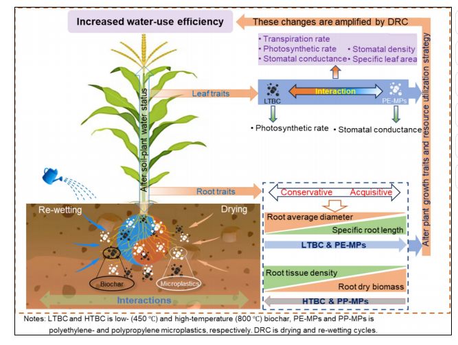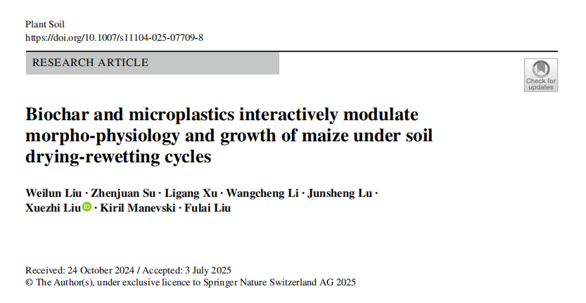 WeilunLiu,ZhenjuanSu,LigangXu,WangchengLi,JunshengLu,XuezhiLiu,KirilManevski,FulaiLiu(2025) Biochar and microplastics interactively modulate morphophysiology and growth of maize under soil dryingrewetting cycles. Plant and Soil.