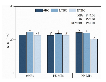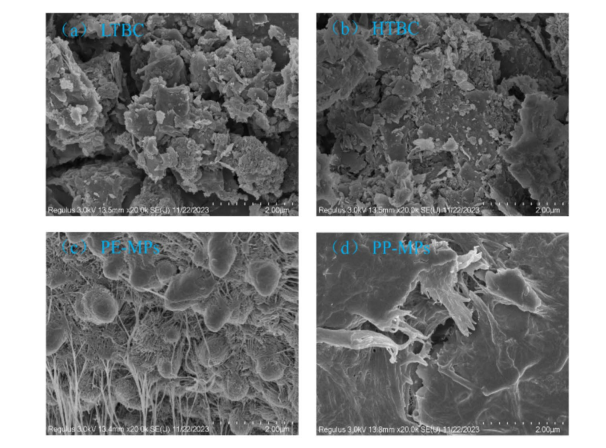��������̿��LTBC��450���Ƚ⣩��΢������Ⱦ��������ͨ����������������׵�ˮ������Ч�ʣ�WUE��������������̿��HTBC��800���Ƚ⣩���������Ӱ�죬���������Ӿ۱�ϩ΢���ϣ�PP-MPs���������С�