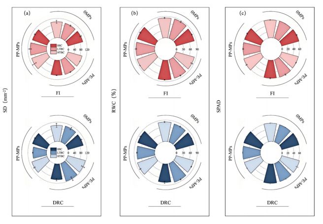 DRC�Ŵ�������̿��΢���϶�������̬���������ĸı䡣���磬��DRC�����£�����ϩ΢���ϣ�PE-MPs���������ܸ����ʣ�TDM����ҶƬ�������WUE��