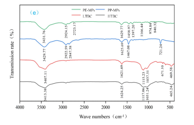 ͼ1.����̿��BC����΢���ϣ�MPs����΢����̬�����������������ɨ�������΢����SEM��ͼ��a,b,c,d���͸���Ҷ�任������ף�FTIR��ͼ��e����