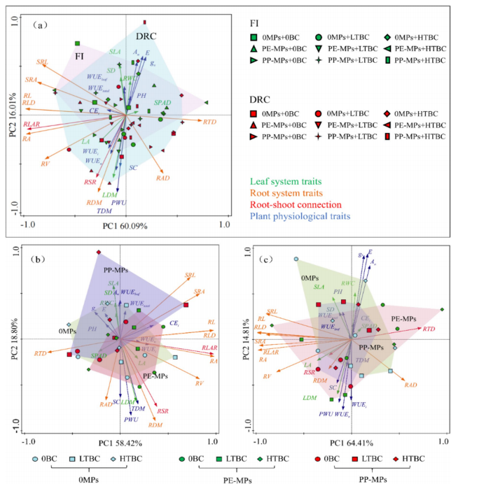 �о�������������ȫ�����ƣ�����3������̿������������̿��0BC��450�����׽ո�����̿��LTBC��800�����׽ո�����̿��HTBC����3��΢���ϴ�������΢���ϣ�0MPs������ϩPE-MPs��PE-MPs���۱�ϩ΢���ϣ�PP-MPs����2�ֹ�ȷ�ʽ����ֹ�ȣ�FI����ʪ����Ñ����DRC���������ڼ�ⶨ����Ҷ��������������ϵ��̬��ˮ������Ч�ʵ�ָ�ꡣ