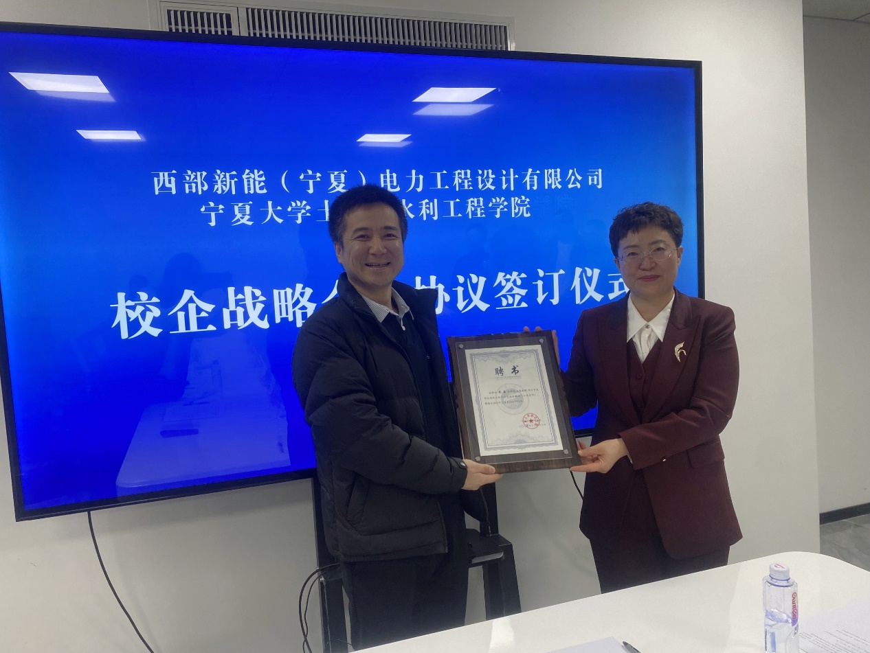 2026�1�19日上午,宁夏大学土木与水利工程学院与西部新能(宁夏)电力工程设计有限公司共同举办了实习实训基地揭牌仪式暨人才合作交流会议,在西部新能公司多功能会议厅顺利召开。本次会议以“深化产教融合,赋能人才培养”为主题,搭建校企协同育人平台,推动电力工程领域人才培养与产业需求紧密衔接。西部新能(宁夏)电力工程设计有限公司总经理周磊、商务总监陈睿、行政总监金久龙等企业负责人,与宁夏大学土木与水利工程学院党总支书记尹娟、副院长刘海峰,党总支委员/土木工程专业负责人车佳玲,土木系系主任包超,土木系、水利系、道桥系党支部书记吕龙龙、吴璞伟、许鹏及部分优秀学生代表共同出席了本次活动�