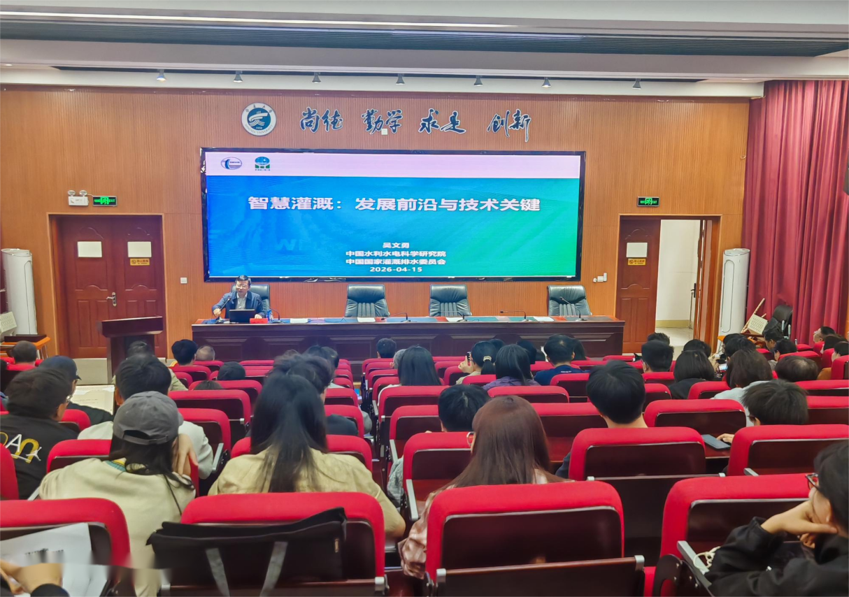 4月15日下午,中国水利水电科学研究院水利研究所副所长吴文勇教授应邀莅临我院,在知行楼三阶报告厅为师生带来了一场题为“智慧灌溉发展前沿与技术关键”的学术报告。报告会由学院副院长李王成主持,学院党总支书记尹娟、副书记冯淑萍、副院长刘海峰出席,水利系教师及智慧水利专业百余名本科生到场聆听学习。