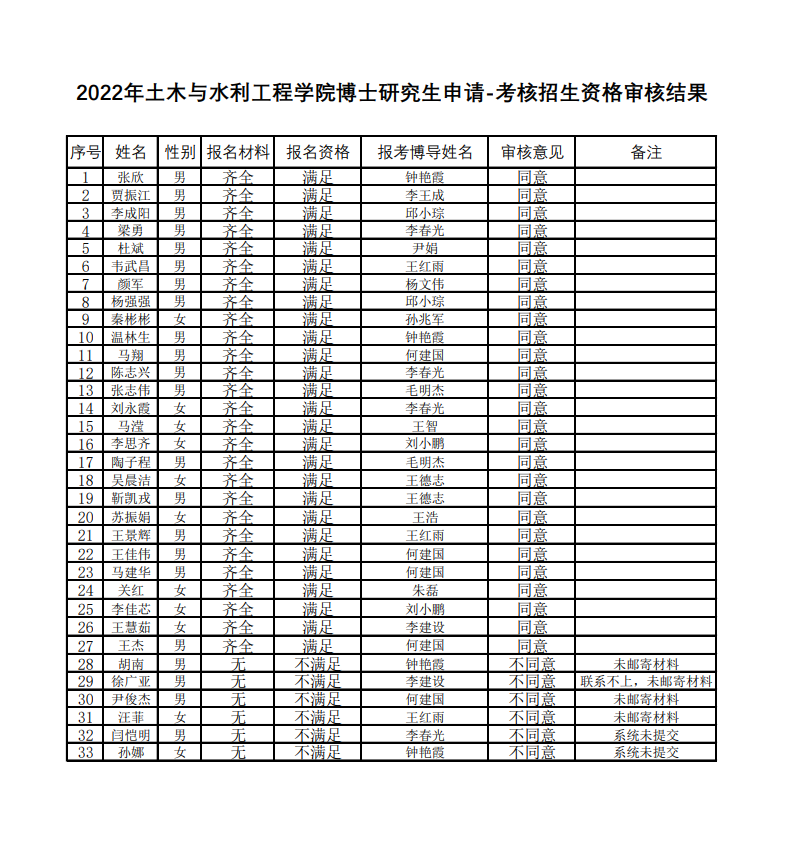 博士研究生申请—考核制招生资格审核结果