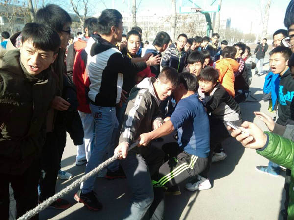 团委学生会体育部主办的新生拔河比赛在C区操场激烈开赛。学院2014级全体学生参加了本次拔河比赛,由体育部担任裁判工作。