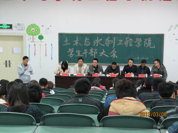于2013年3月6日在工科楼三阶教室召开了全院学生干部大会。学院党总支副书记张强老师,学办主任郭利老师及全体辅导员老师出席了本次大会。第九届团委、学生会干部和各班主要班干部参加了此次大会。大会由郭利老师主持。