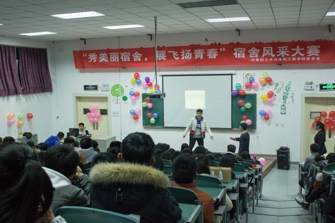 活动初始,男生宿舍611以幽默诙谐的语言介绍了他们宿舍的6名男子汉,教室里时不时的响起同学们的掌声与喝彩声。其他宿舍也毫不示弱,各宿舍代表都使出了浑身解数,努力将宿舍的特色介绍给各位评委与现场观众。在“自我介绍”环节完毕之后,现场又迎来了新一轮的高潮——才艺展示。612宿舍三人合唱的《老男孩》引人入胜,224宿舍的《想西藏》,222宿舍的《大王叫我来巡山》给我们带来生动的视觉享受。歌曲、舞蹈、小品等多种形式都展现出参赛宿舍的风采。