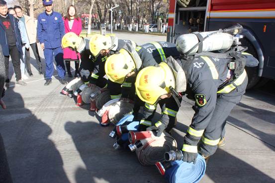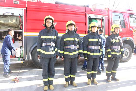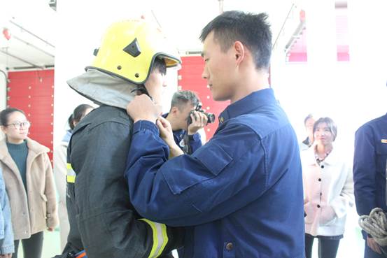 首先消防支队消防员班长付饶向同学们详细介绍了消防车的类型、用途、性能及适用范围,同学们饶有兴致地亲身触摸消防车辆、器材装备。消防员在带领学生登上消防车平台,演示了破拆类、照明类、防护类等器材装备后指导同学们进行实际操作演练。其次,范立刚处长安排消防指战员讲解了消防服的作用及材料并组织四名同学亲自体验穿消防出警装备,进行水带连接、抛洒等训练。