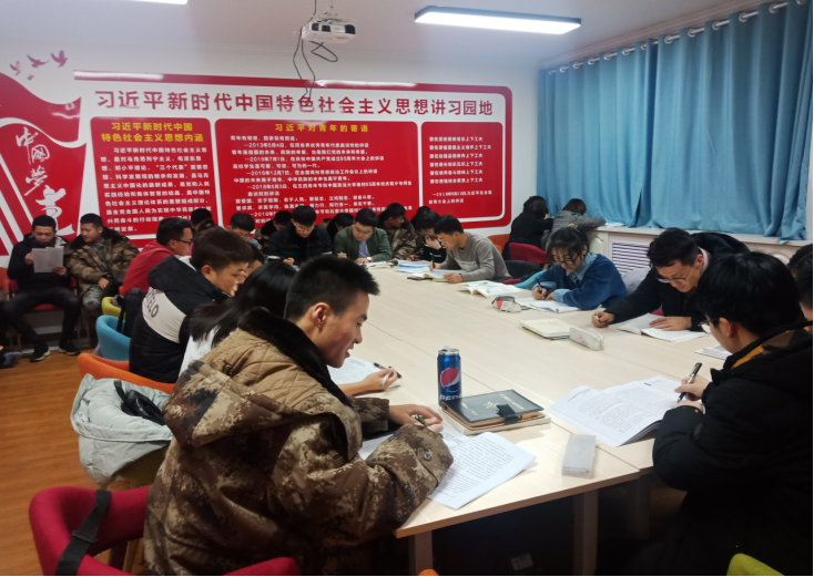 2019�11�20�,交管本科党支部在党员活动室举行“不忘初心、牢记使命”主题教育补学会议,补学成员刘辉,王常凌、吴婷参加会议�