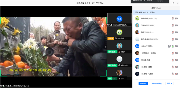 活动在简单的清明知识问答中拉开序幕,大家共同观看抗战影视剪辑片段,并由参与同学分享他们准备的抗日英雄故事,了解并铭记那些为新中国成立抛头颅洒热血的先烈们,表述自己对先烈的崇高敬意。主持人播放了一个抗击疫情的视频,感受这段时间以来中国所遭受的磨难,以及那些逆行者不顾自身安危,为国为民勇往直前的伟大精神;紧接着由土木2班的两名同学为大家朗诵诗歌《清明情思》;最后,活动在《使命之旅》MV中后落下帷幕。