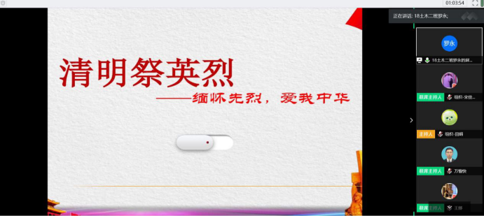 2018级土木2班、水利水电班和2019级土木1班、水利水电班四个团支部共同开展了本次“清明祭英烈”线上主题团日活动。参加本次活动的老师有18级辅导员王娜和19级辅导员万愉快。