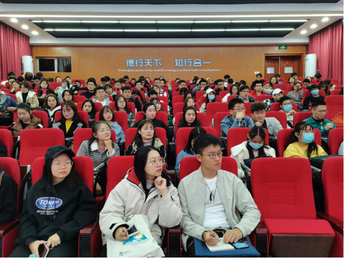 于2020年11月6日中午在知行楼三楼阶梯教室举行学生就业创业培训讲座,本次讲座由外国语学院党委副书记余洁主持,学生工作办公室主任王娜参与,就业创业大赛的全体参赛学生参加此次讲座。