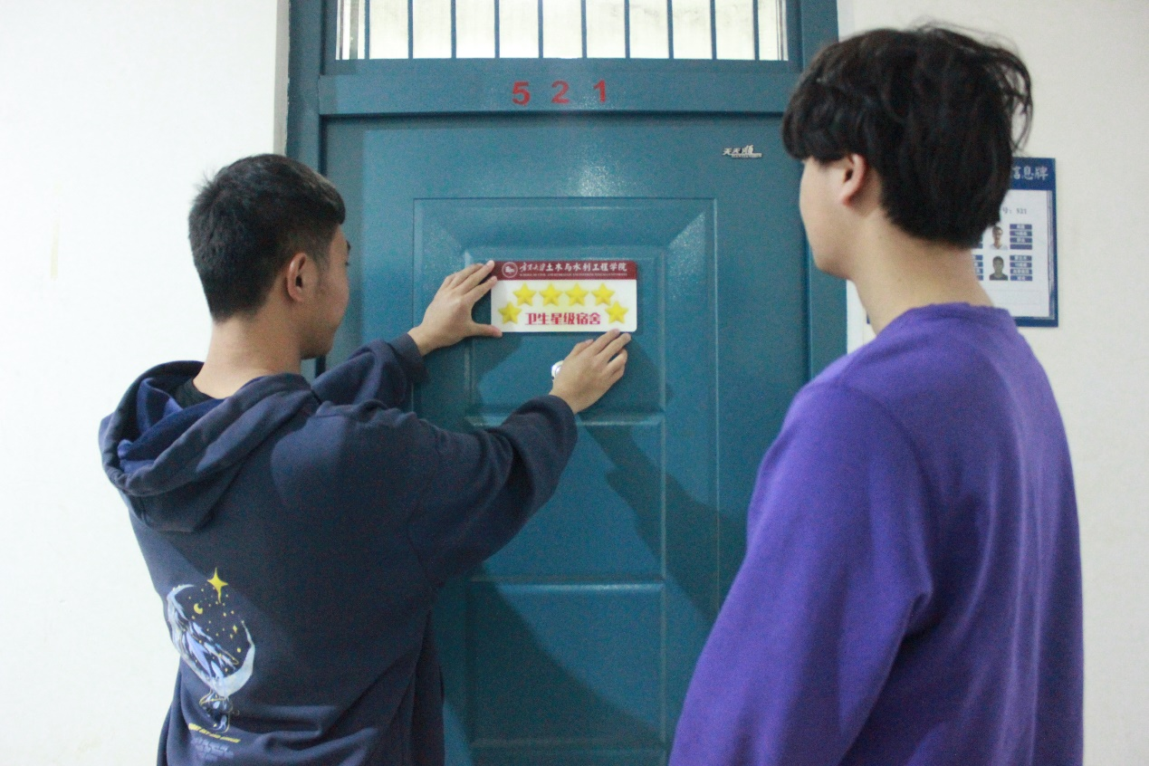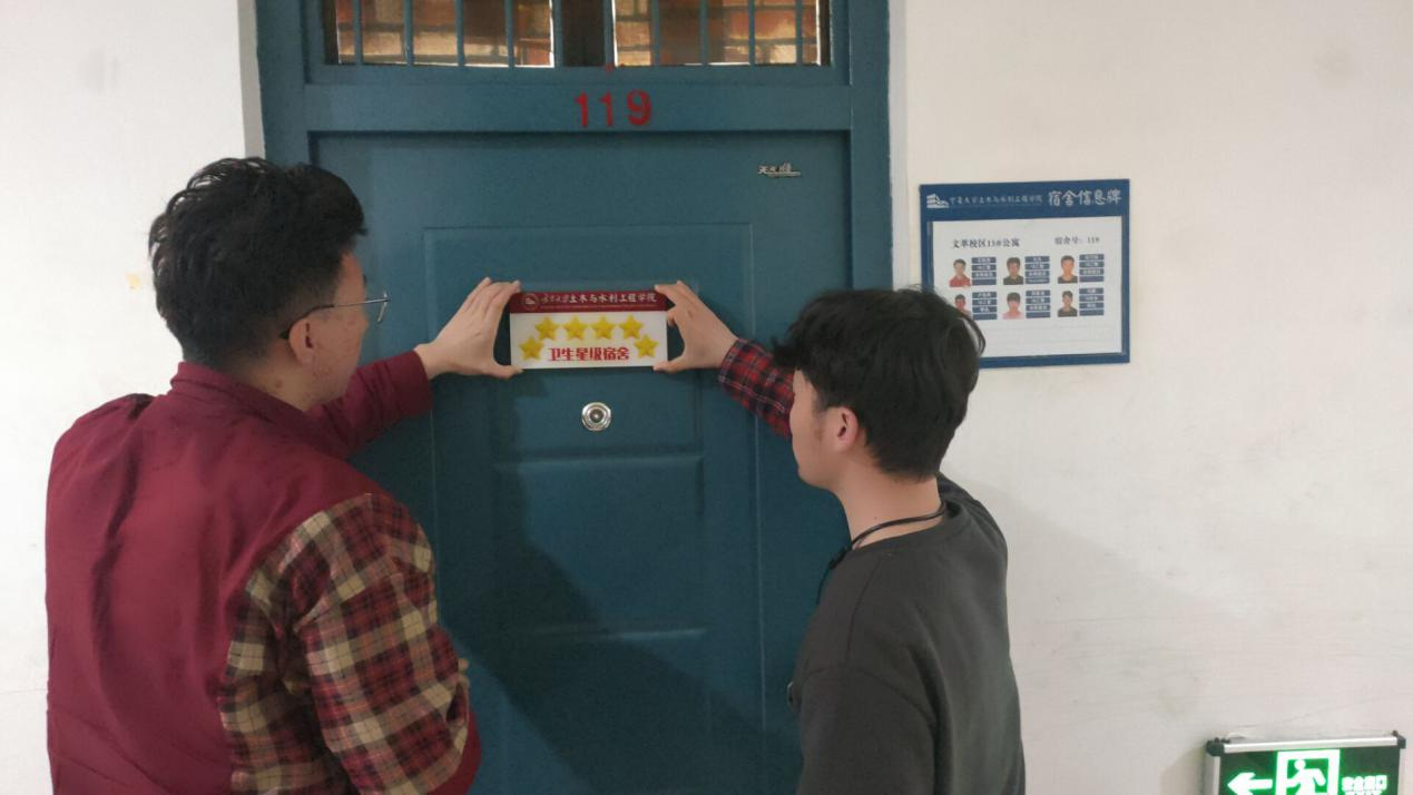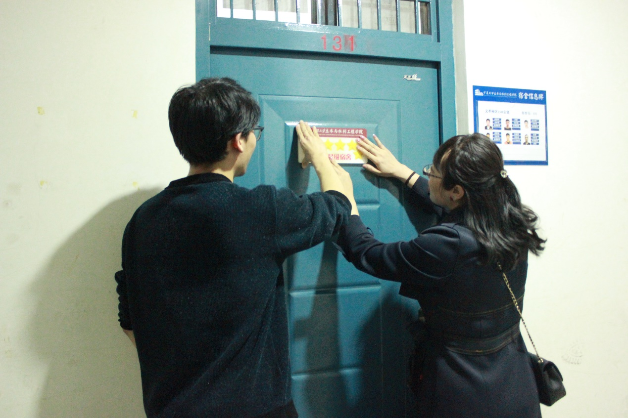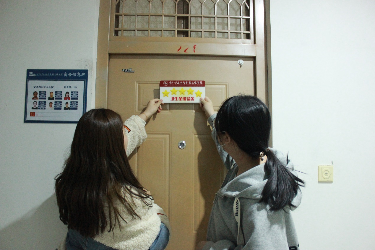 于13号公寓楼、15号公寓楼举行星级宿舍挂牌仪式。学办主任王娜、学生会主席团成员王凡、团委宣传部负责人许祺祺、学生会文艺部主要负责人冯梦圆、易班工作站学风建设部主要负责人张彦波参加此次仪式。各位负责人为优秀寝室挂牌,鼓励各优秀寝室再接再厉,部分寝室成员合影留念。同学们积极回应,表示会在新学期再接再厉,继续保持良好的宿舍卫生情况。