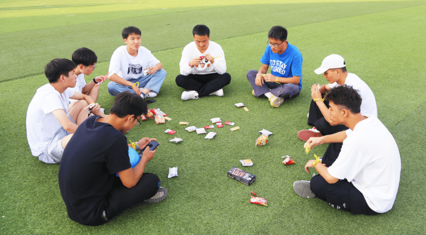 第一个活动是随机应变大比拼,该活动分为两个小游戏,所有学生围成一个大圈坐在操场上,第一个游戏是圈内同学按照顺序说出数字1,2,3…在每位选手不知情的情况下来抢答数字,不能同时有两个选手喊出相同的数字,并对同时起身抢答者进行小组扣分。第二个游戏是丢毽子的比赛,绕圈将毽子丢在随机一个学生的身后并迅速回到自己位置,该学生要在对方回去之前追上对方则可以为自己小组得分,反之就要挑选下一个幸运儿。