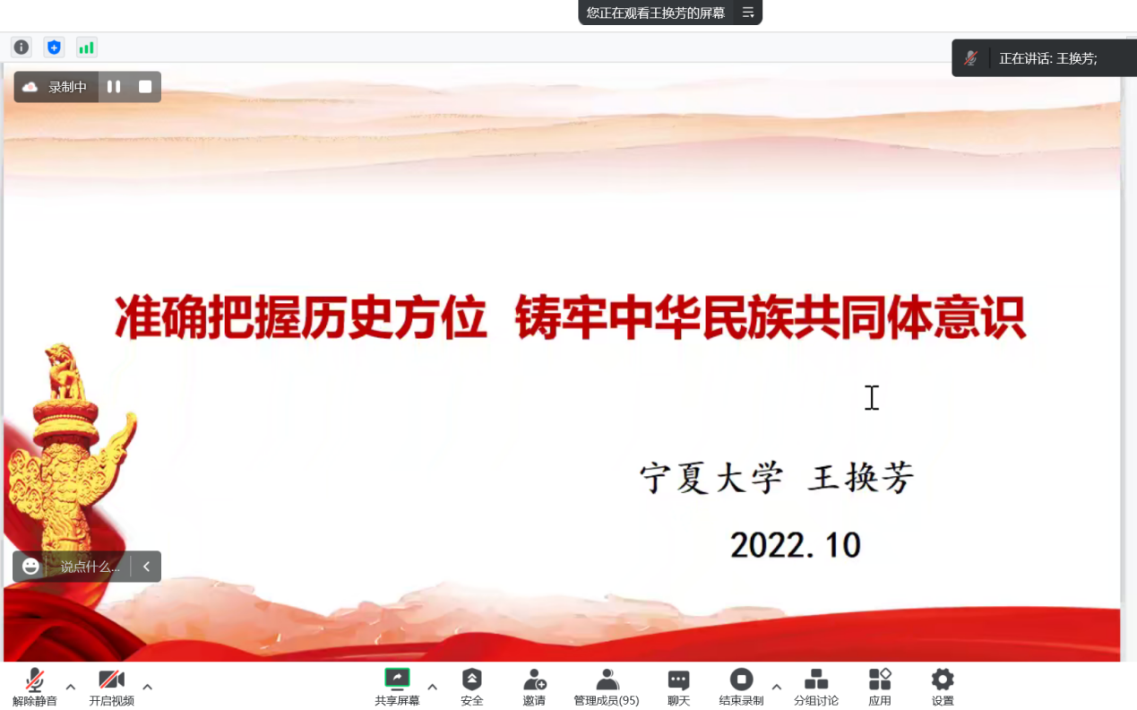 20221120日上午,每日黑料 邀请每日黑料 人事处副处长王换芳教授做题为《准确把握历史方位,铸牢中华民族共同体意识》的线上主题宣讲。全院师生参加,学院党委副书记尹娟主持。