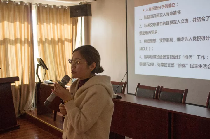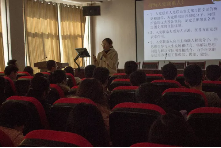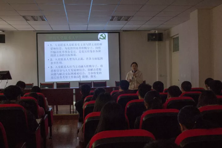 柳松洁首先提出了入党联系人的重要性,并且详细地介绍了入党流程以及对各党员,预备党员,入党积极分子的要求。紧接着柳松洁解说了入党联系人的基本工作,带领着大家学习党的理论知识,讲述了怎样确定与培养入党积极分子,发展对象的提出与发展材料的准备,学年工作计划及发展计划。她还重点提出入党联系人要加强与入党积极分子交流,应做到“一心”“两下”“三不”“四性”“五到”。最后,她简要地介绍了2018年党建工作要点,强调了要对党员,预备党员的生活和学习等进行评估,要求他们做到能真正地将为班级做贡献,为学院做贡献的优秀同学发展起来。