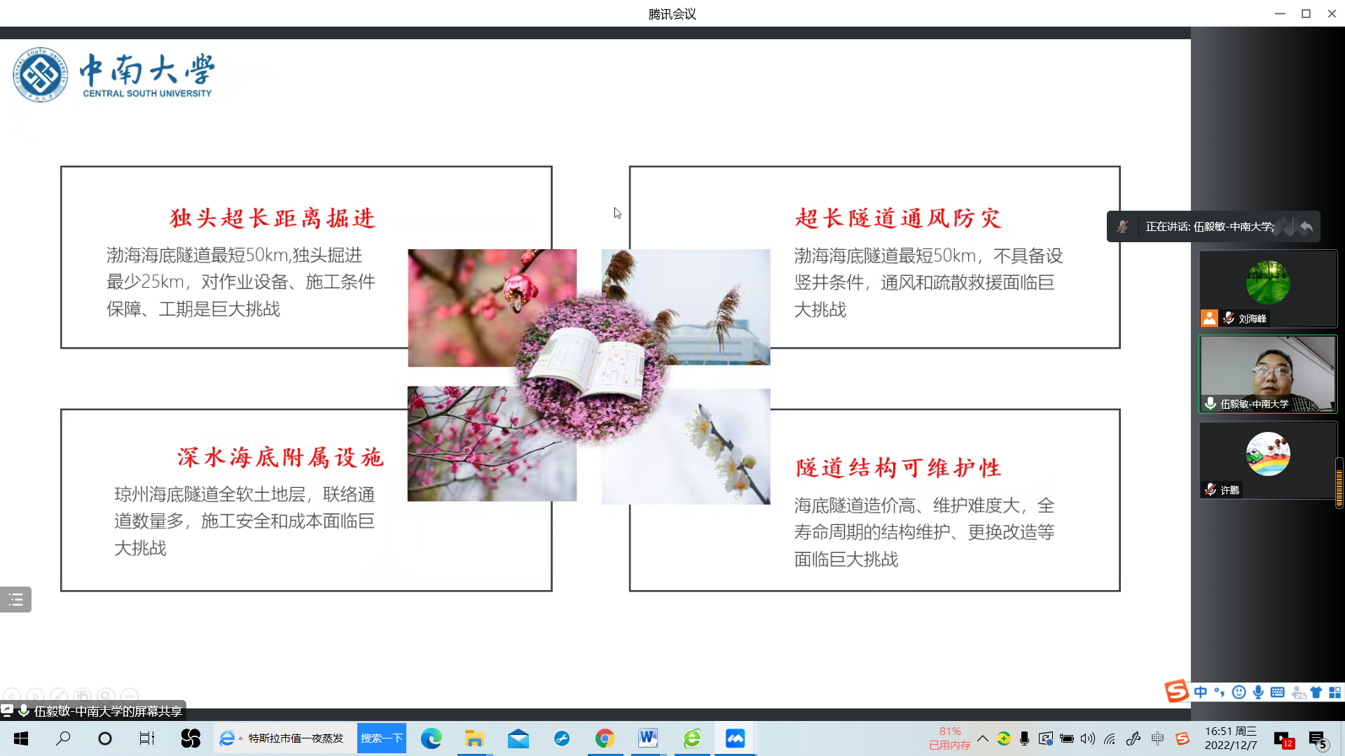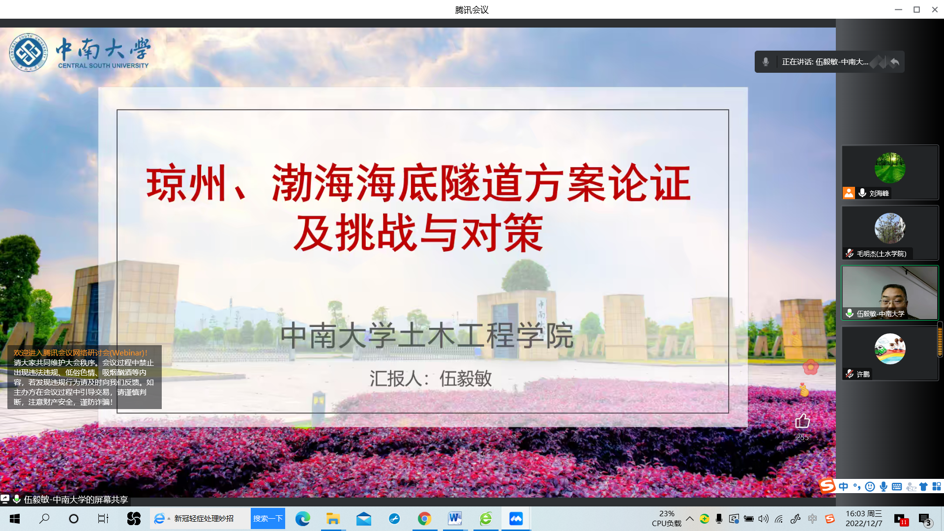 师生做题目为“琼州、渤海海底隧道方案论证及挑战与对策”的线上学术报告,报告会由毛明杰院长主持,刘海峰副院长和学院师生共100余人参加了报告会。